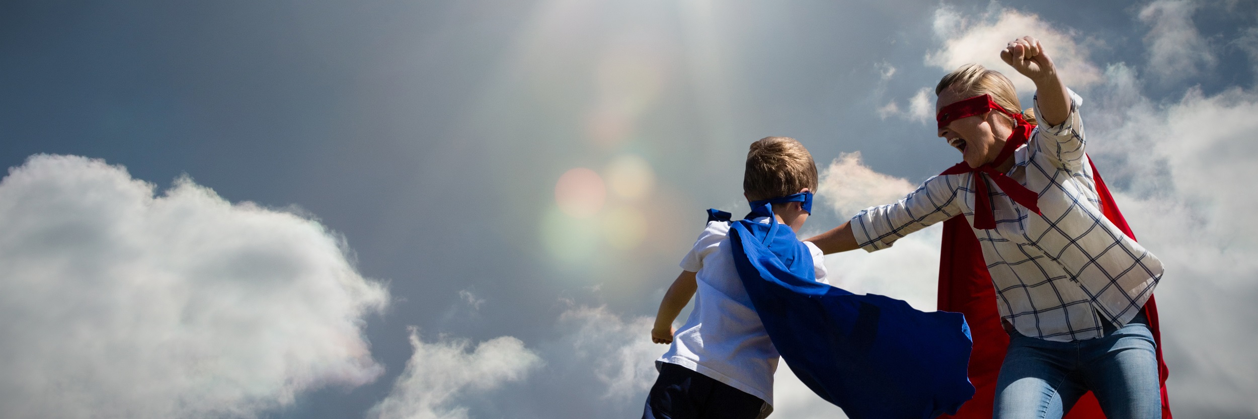 Mother and son pretending to be superhero against cloudy sky with sunshine